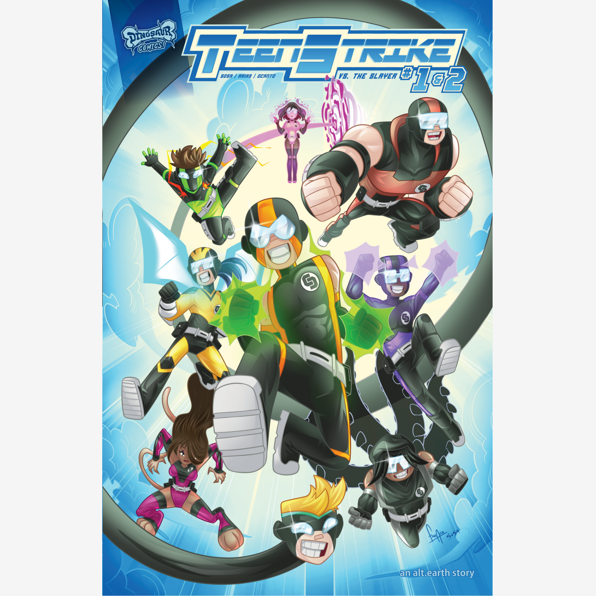 TeenStrike #1 & #2 is a 60 page comic book combining the first two issues to bring you one massive compilation that introduces you to the world of TeenStrike! Come along as we set up the first story arc (TeenStrike vs. The Slayer) in this first, MEGA ISSUE! The first in this seven issue story arc.